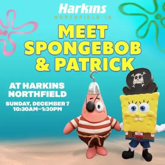 Visit Harkins Northfield on December 7 from 10:30AM-1:30PM to take your photo with SpongeBob and Patrick!