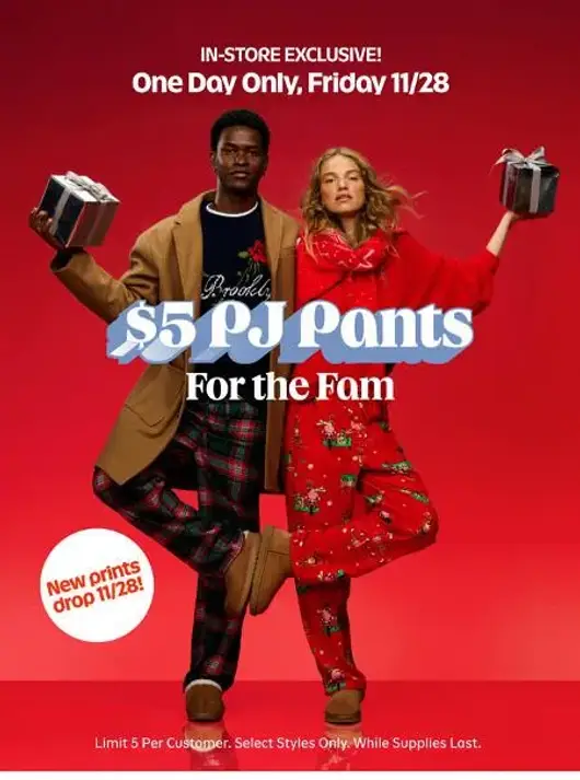 Offer valid 11/28/25 at Old Navy stores in the United States (including Puerto Rico) only. Offer not valid at Old Navy online. Excludes Clearance and items sold and shipped by third parties. Maternity, Toddler & Baby 0-24 Months. Limit 5 per transaction. Select styles only. While supplies last. No adjustments on previous purchases. Cannot be combined with other offers or discounts, including Gap Inc. employee discount.