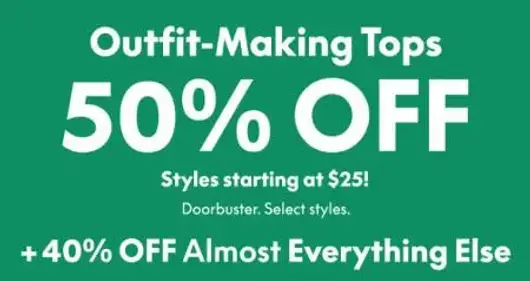 Shop in store and get 50% off tops + 40% off almost everything else.
